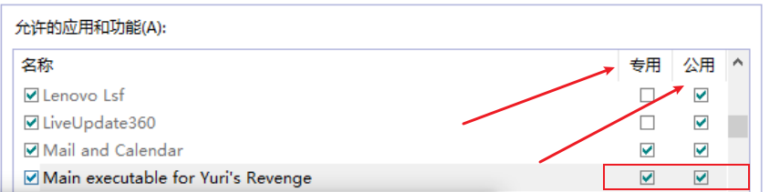 在允许的应用和功能的列表框内,找到刚刚添加进去的复仇时刻主程序进程名,并将其勾上其专用 公用的复选框,如图所示,最后,点击右下角的确定按钮即可!
